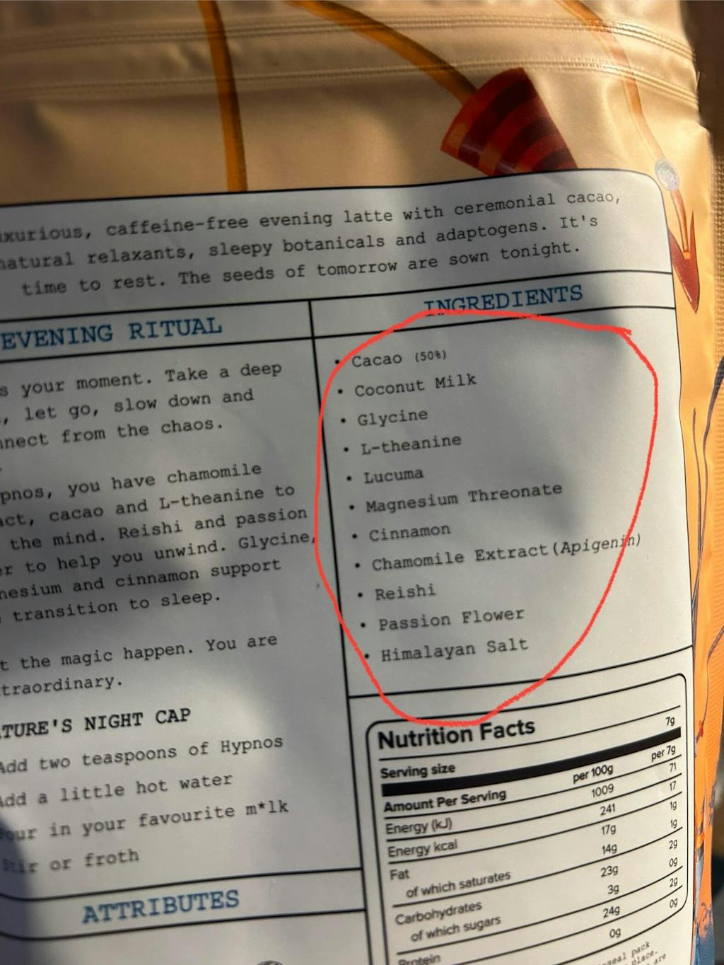 Cacao, Coconut Milk, Glycine, L-theanine, Lucuma, Magnesium Threonate, Cinnamon, Chamomile Extract(Apigenin), Reishi, Passion Flower, Himalayan Salt