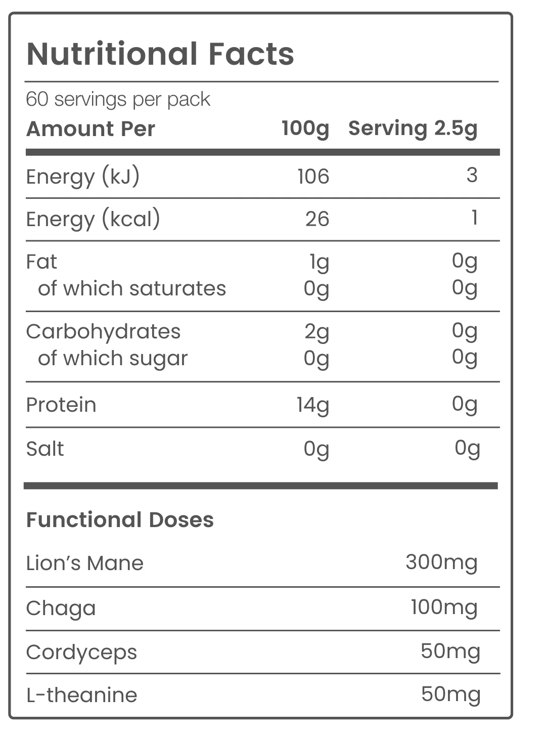 Instant Arabica Coffee (80%), Lion's Mane, Chaga, Cordyceps and L-theanine
