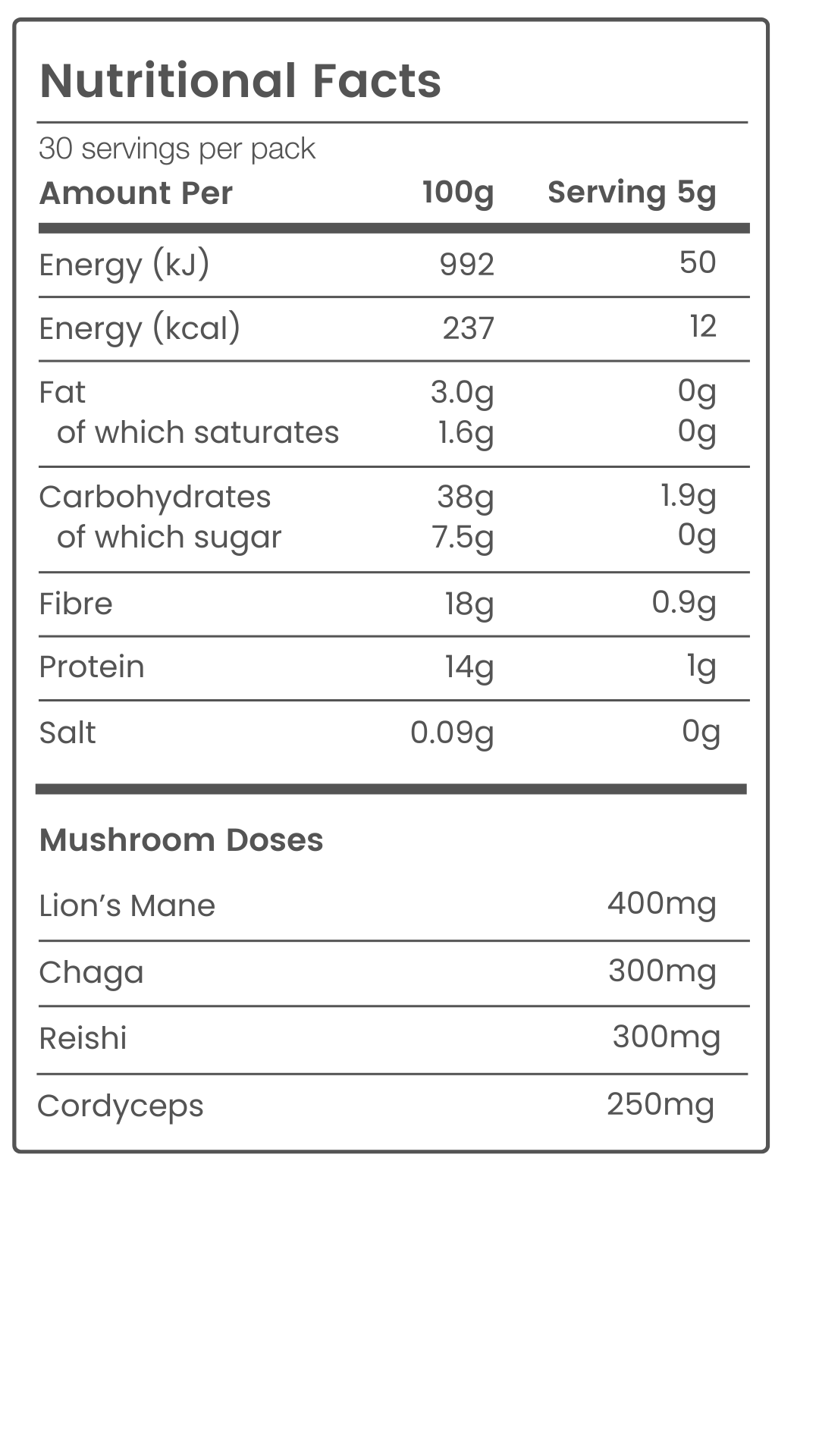 Cacao, Decaf Arabica Instant Coffee, Lion's Mane, Lucuma, Turmeric, Cinnamon, Chai Spice Mix (Ginger, Cardamom, Cloves, Fennel, Black Pepper, Nutmeg and Star Anise), Reishi, Chaga, Cordyceps, Maca and Vanilla